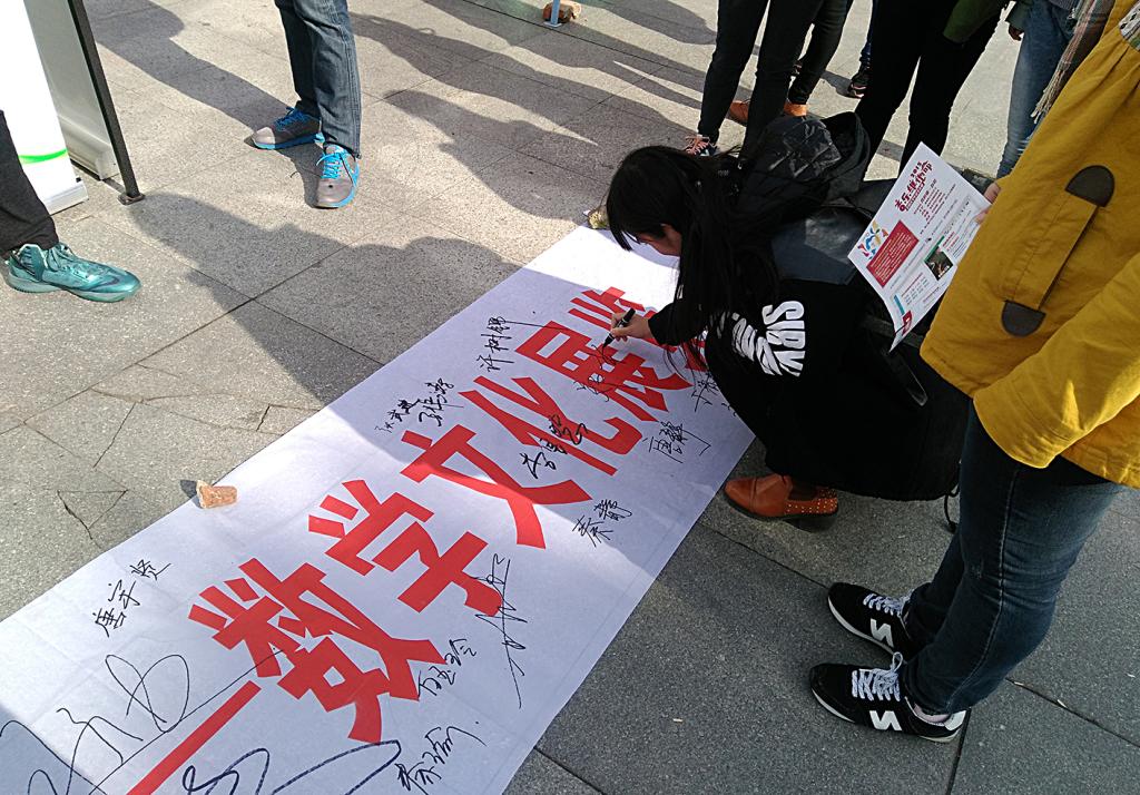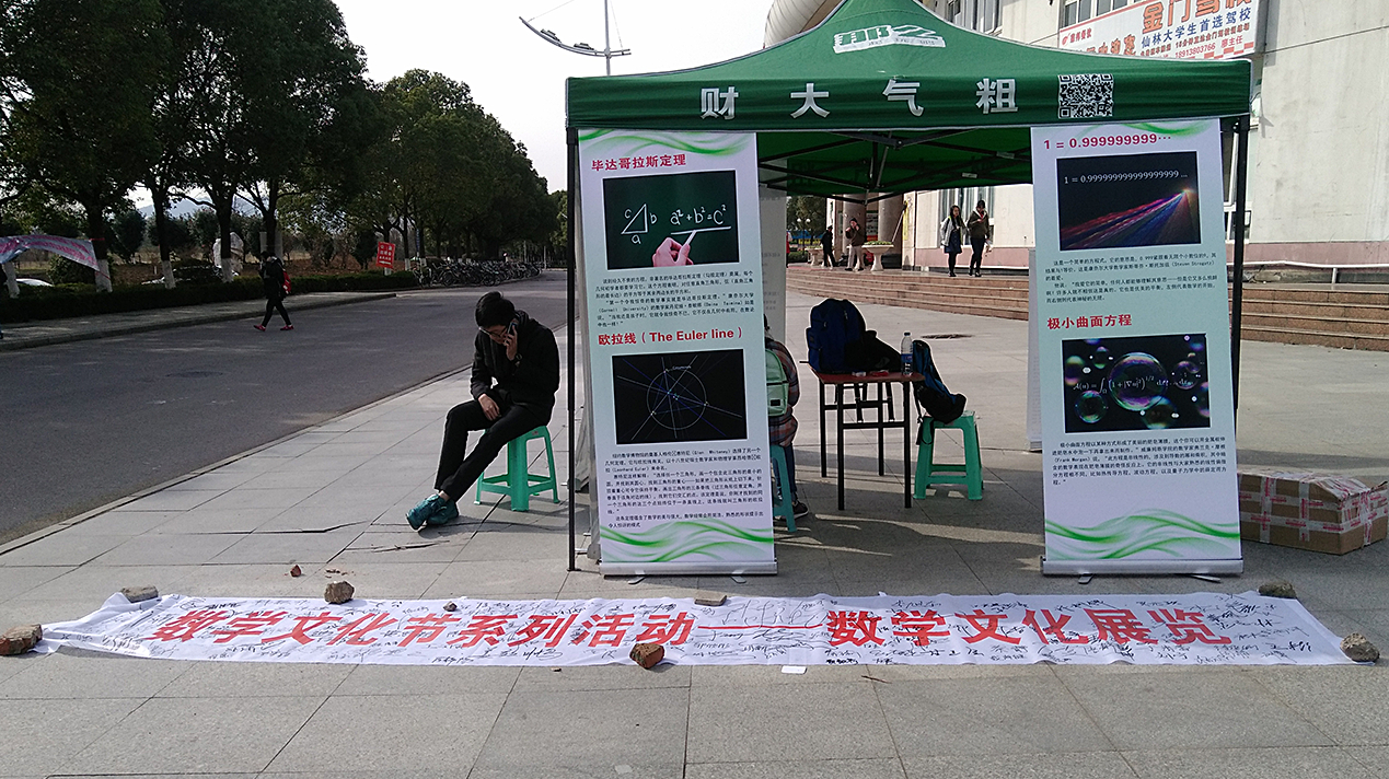 活动现场同学在横幅上签名,观看数学文化的展示,了解数学的文化。通过一些经典的数学公示和数学名人的故事,向全校员工普及数学文化。此次活动是在学校着力建设学术云顶集团、人文云顶集团的背景下开展的。为响应学风建设月的号召,在大学校园内营造分享数学学习方法,打造“玩”数学理念的学习氛围。