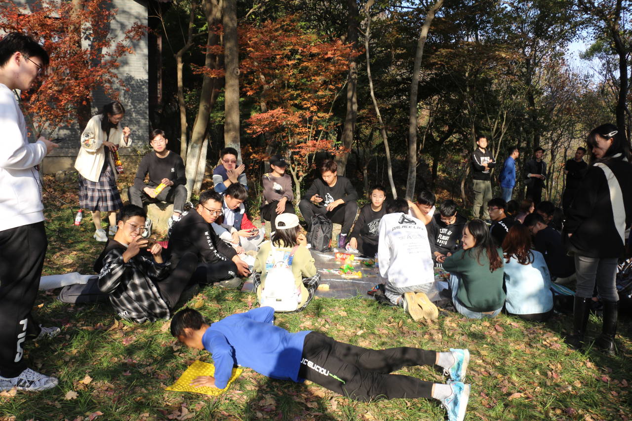 员工会志愿者在对外交流中心外联组负责人的带领下在学校西门集合,准备前往联谊的地点栖霞山,大家迫不及待地出发,一路欢声笑语。到达目的地之后,大家已经热血沸腾,准备好攀登栖霞山。我们勇往直前,克服困难,向着集合地点进发。路上的枫叶美景令我们陶醉,真有“停车坐爱枫林晚”的感觉。经过一个小时的努力,最终到达集合点,见到了南师大的同学们。我们在草坪上铺好垫子,围在一起,先做自我介绍,之后同学们津津有味地吃着零食,开始玩起大冒险游戏,在游戏中增进了彼此的了解,初见的拘谨也渐渐消失,游戏惩罚的方式十分有趣,有指压板俯卧撑,男女对歌等。每个人都玩的不亦乐乎。在一个多小时的游戏后,大家继续爬山,怀着不到山顶非好汉的心情,克服几乎垂直的山路终于登上山顶。接着大家一起合影留念、休息,在秋风的吹拂下谈心。近黄昏时,大家都依依不舍的走下山去,联谊活动圆满结束。