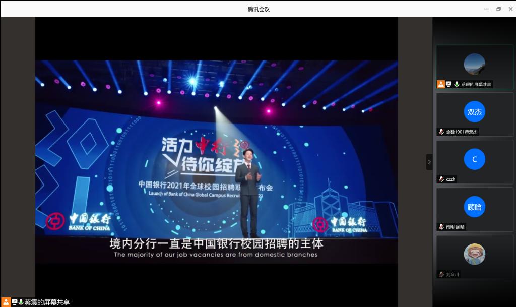 宣讲会伊始,蒋震助理放映了职位发布现场宣传片、常州分行成立40周年宣传片和中行外派员工在五四青年节的祝福视频,帮助同学们了解中国银行成立至今的历史以及中行的的管理理念,让同学们体会到中国银行常州分行的担当。接着,蒋震助理结合自身经历详细分析了各个职位以及入行以来的个人发展历程,整个过程详尽明确。最后,蒋震助理就同学们提出的问题进行了相关的解答,讲述了招聘的具体流程和中行笔试面试的注意事项及入职后的相关能力要求,重点分析了中国银行相较于其他银行的优势,并诚挚邀请同学们加入中国银行常州分行。