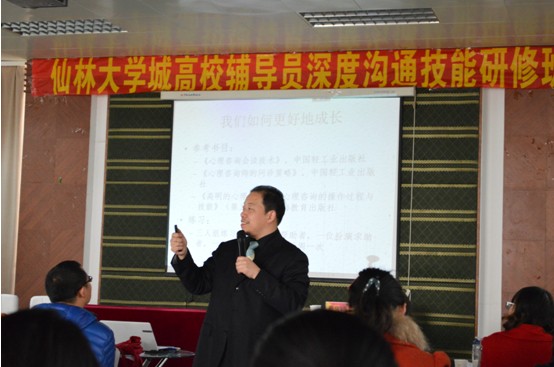 此次培训旨在传授辅导员基本的心理沟通技巧和判断心理倾向的方法,提高辅导员处理员工心理问题的能力,同时也为各校辅导员提供了一个切磋技艺的平台。整个研修班为期三天,共分三个环节。前两天的培训活动由南京大学心理教育与研究中心副主任费俊峰老师主讲。费老师生动幽默的讲课风格和互动式的授课方式,充分调动了学员们的积极性,学员们在分组活动中既可以相互学习又锻炼了沟通技巧。15日上午,由南京师范大学的周红教授给大家做了题为“赢在沟通”的讲座。周教授将讲座内容与亲身经历充分融合,带领学院剖析自己内心世界,其深厚的理论功底和深刻的实践感悟深深的打动了每一位学员的心。15日下午进行了分组讨论环节,各组成员在专职心理辅导老师的指导下分享了自己的辅导经验,提出了自己的辅导困惑。随后大家针对“网络成瘾”、“女生心理辅导”等问题展开集中讨论,各抒己见,由心理辅导老师予以剖析和点评。