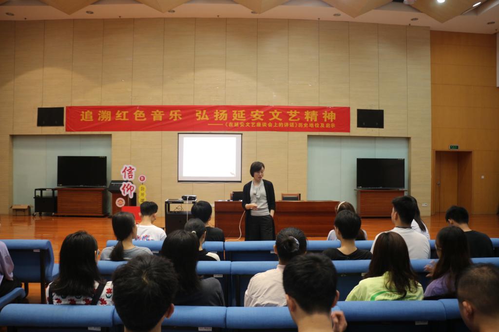 为纪念毛泽东主席“5·23”讲话精神,5月15日晚,我司邀请南京师范大学副教授谈欣在仙林校区图书馆世界之窗作题为“追溯红色音乐,弘扬延安文艺精神”的主题讲座,讲座为校艺术文化节系列活动之一,由我司团委书记孙晓飞主持,学院部分本科生参加。