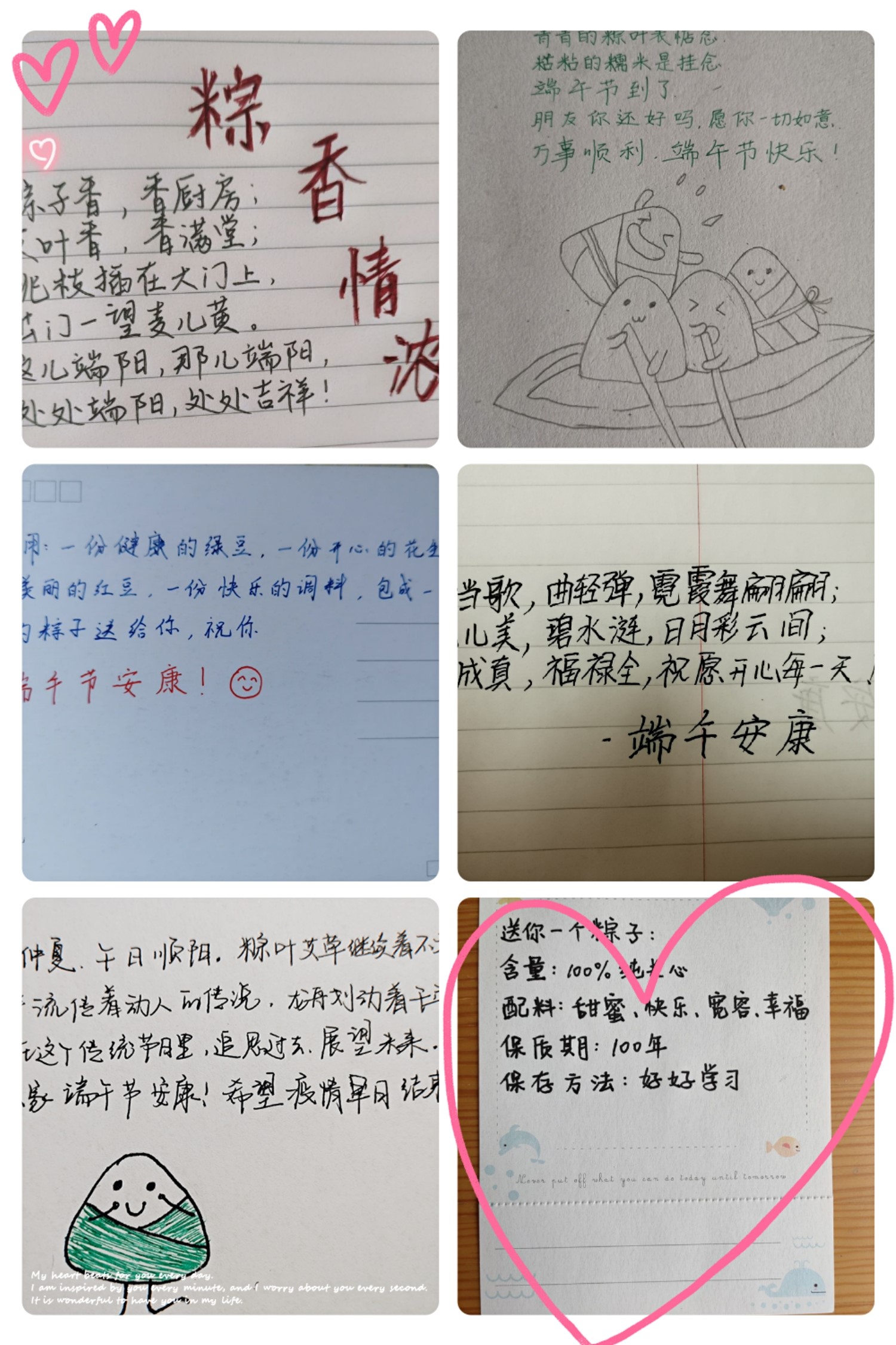 院分团委举办了“浓情端午,爱在心中”端午手写送祝福活动。活动期间,同学们用青涩而温暖的笔触,传达出自己的满腔深情。“送你一个粽子,含量:100%纯关心”,“处处端阳,处处吉祥”,“端午安康”,“粽香情浓”等等,每一个字眼都流露着对身边亲人和远方同伴的感恩和祝福。此外,还有一些同学在祝福旁附上了图画,赋予粽子人的特征,或是乖巧的微笑,或是怀抱着爱心,尤其是那幅可爱的粽子们合作划龙舟的场景,既有节日的氛围,又让我们怀念在校时团结的大家庭,也象征着数院学子奋力向上的形象。