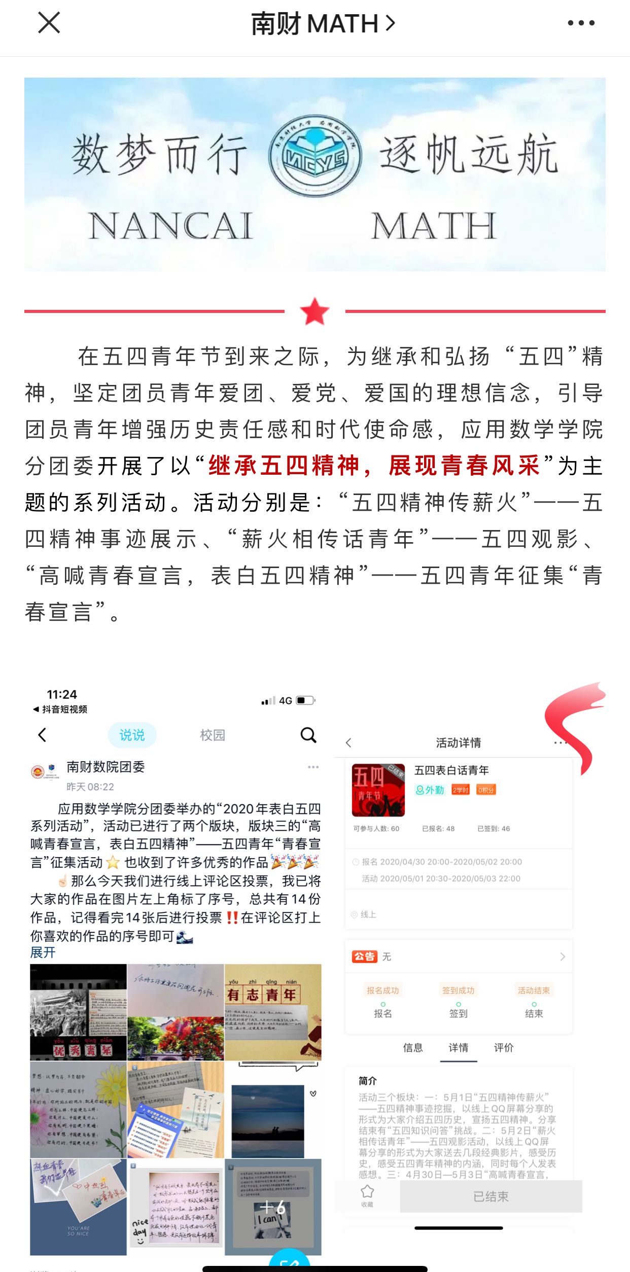 本次活动使得同学们深刻意识到了五四精神是中华民族的精神财富,是中国青年爱国热情的体现。此次新冠肺炎防卫战中青年的表现,就是对五四精神最好的诠释。作为当代青年,我们须牢记五四精神,把个人命运同国家命运相结合,为实现中华民族伟大复兴而奋斗,争做有本领、有担当的中国好青年!相信通过此次五四系列活动,每一位数院学子都能珍惜韶华、潜心读书、敏于求知,做到心中有阳光、脚下有力量,在人生的航程上不断乘风破浪,奋勇前进。