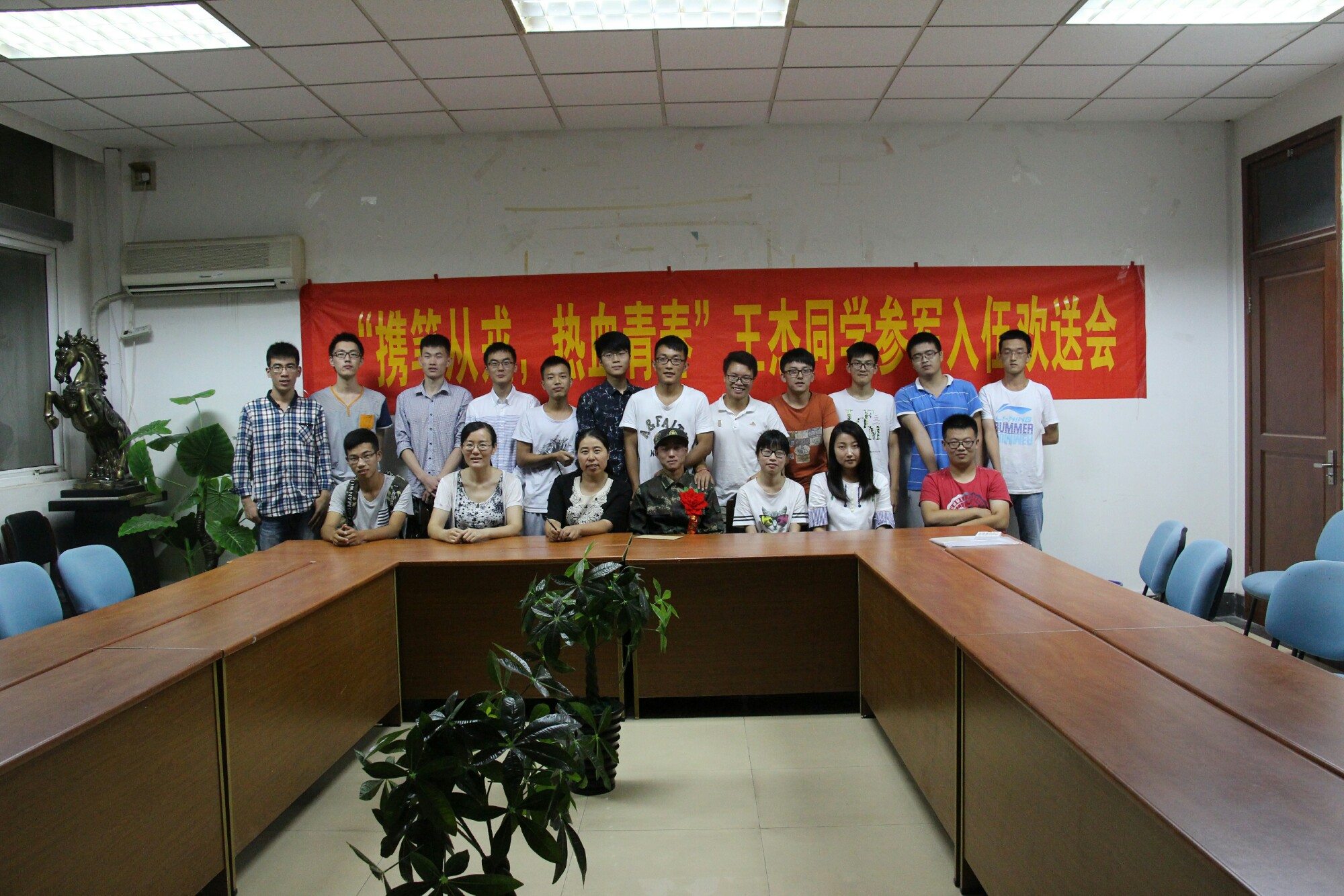 在场的每位同学都给王杰同学现场送祝福,有的同学用肺腑之言表达了对王杰同学的祝福,有的同学用歌声表达对王杰同学的祝福,有的同学用现场的行动为王杰同学送去祝福,为王杰同学佩戴大红花,祝福他成为一名光荣的军人。