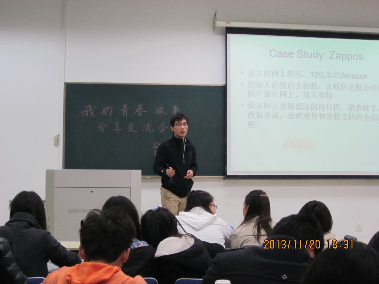 2013年11月20日晚,云顶集团金数1301班全体同学,在理工学科楼104进行了“我的青春故事分享交流会”。本次交流会邀请到了蒋意殊学长、陈晶学姐和郁舒涵学姐分享他们的青春故事。