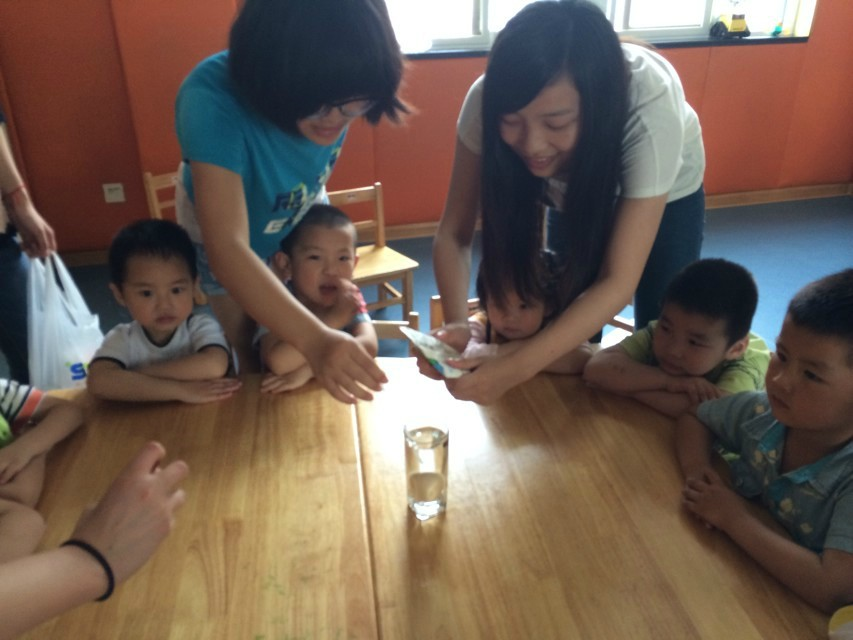 首先,我们做的是鸡蛋在盐水中浮起来的实验,小朋友对鸡蛋很感兴趣,也对盐很感兴趣,为了让下朋友感受盐的味道,我们让他们都尝了一点,大家都“吃”得很开心。当我们把鸡蛋沉入清水中,再放盐搅拌时,可爱的孩子们还很配合的喊加油,鸡蛋最后也不负众望浮了起来,我们这些志愿者们也跟着孩子后面欢呼起来。
